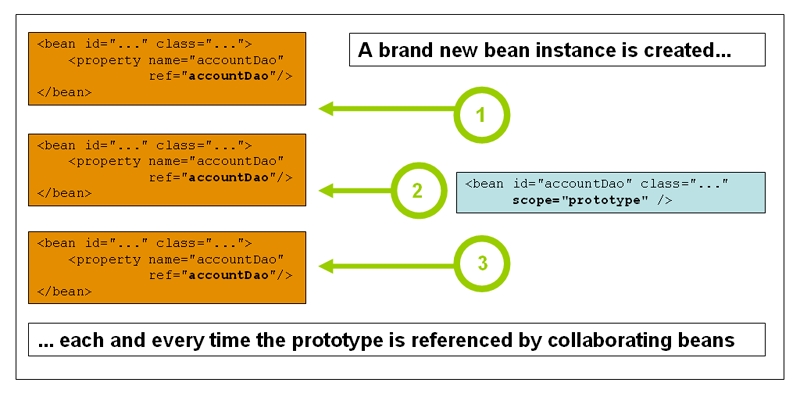 <bean id="accountService" class="com.something.DefaultAccountService" scope="prototype"/>