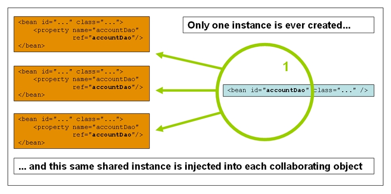 <bean id="accountService" class="com.something.DefaultAccountService" scope="singleton"/>